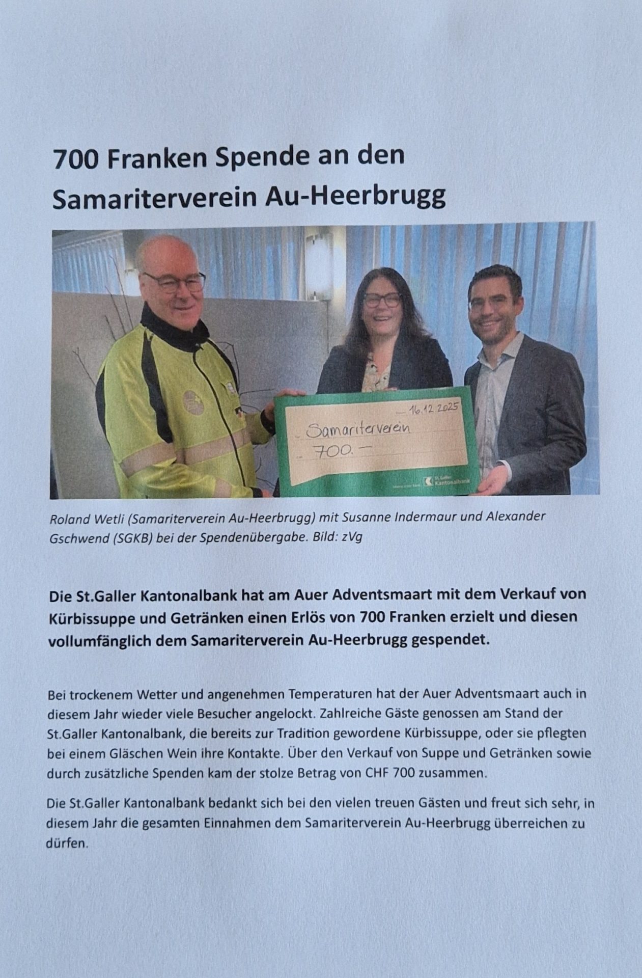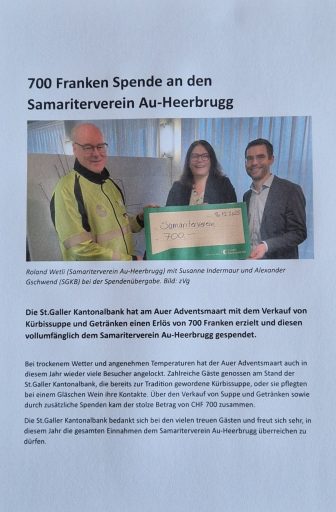 Im Namen des Samariterverein Au-Heerbrugg möchten wir Ihnen unseren herzlichsten Dank aussprechen. Ihre Unterstützung und Ihr Engagement bedeuten uns sehr viel und tragen wesentlich dazu bei, dass wir unsere wichtige Arbeit für die Gemeinschaft erfolgreich weiterführen können. weiterlesen “700 Franken Spende von der St.Galler Kantonalbank Au”